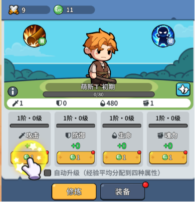 1:前期升级可以给自己主角进行加点,可以平均分配,长按可以快速升级,等级达到300级或者神王特权等级达到1级就可以开启自动升级了,会平均分配四种属性进行加点,主角旁边有一个主角突破任务,通过完成任务条件可以对主角进行突破,等级达到40级并完成突破任务可以进行转职。