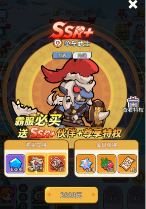 4:氪金玩家也可以选择购买SSR+单车武士,前期的大肉盾,还有输出范围技能,又肉又有输出,购买还会赠送尊享特权,每天可以领取培养材料和召唤券。