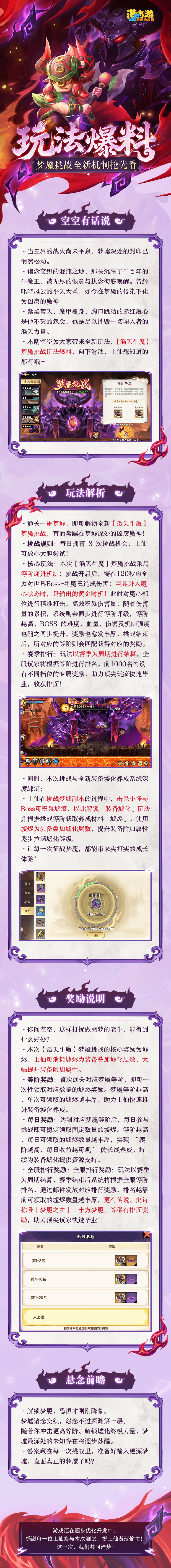 空空作为内部体验官,抢先替大家上手了一波「滔天牛魔」梦魇挑战,唤醒深陷噩梦中的老牛可不是件轻易的事儿,但俗话说得好,风浪越大“鱼”越贵,越激烈的挑战收获的也越多哦~本期空空奉上精心准备的「梦魇挑战」全新机制玩法爆料,涵盖玩法解析、奖励说明等丰富内容,点击查看,上仙想知道的都有哦~