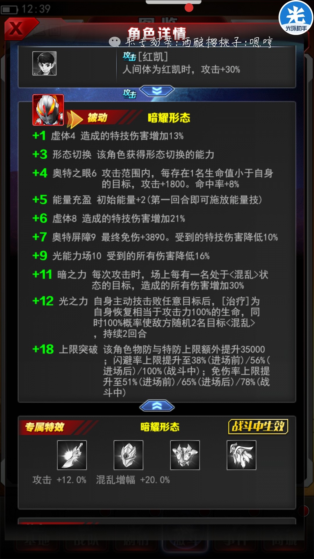 +7奥特屏障9最终免伤+3890。受到的特技伤害降低10%,特技伤害哇,还是很可以。