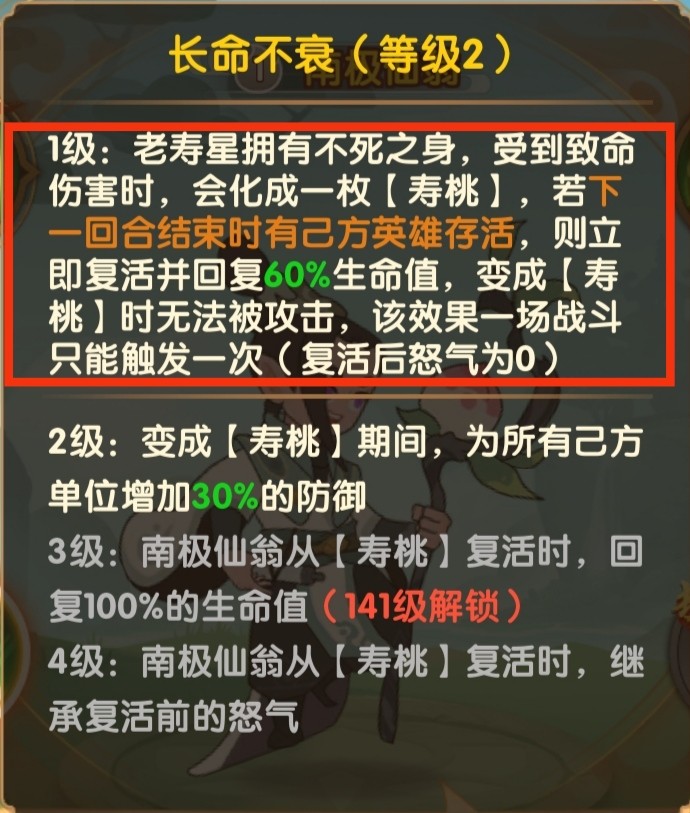 当南极仙翁受到致命伤害时,会变成一个无法选中攻击的仙桃,下回合复活。这个复活技能在一个辅助身上看上去非常鸡肋,因为在辅助面板中,没有传统肉盾的高血高防,就算满血复活也是被秒杀的存在。