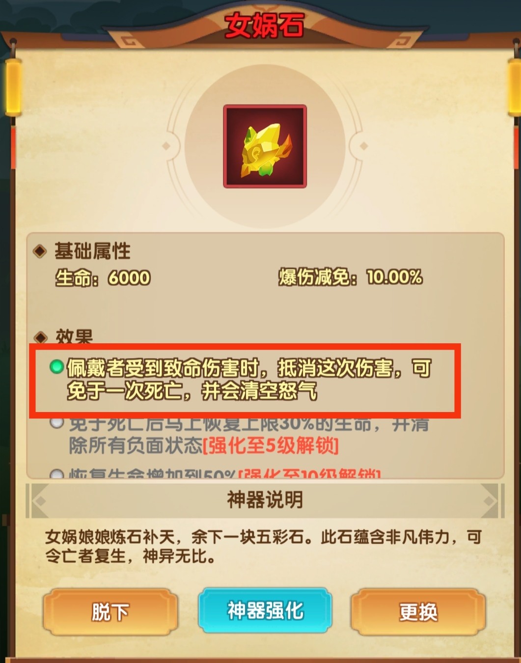 佩戴者受到致命伤害时,抵消这次伤害(伤害来源包括普攻和大招),可免死一次,并清空怒气。