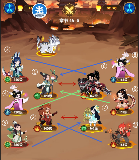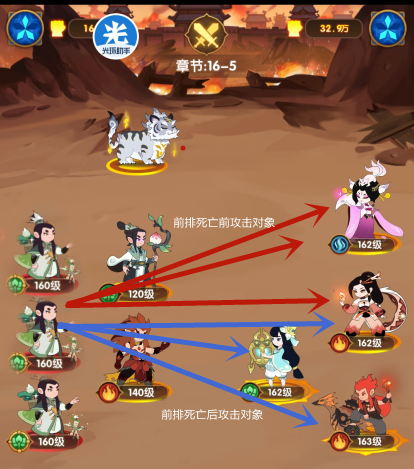 如果输出位站在中后排,那么在击杀掉上前排的南极仙翁后,由于攻击顺序的设定,敌人会更换攻击对象输出,不会选择红色线,而是选择蓝色,这样对我们其他英雄血量会受到很大威胁。此时让南极仙翁率先阵亡变仙桃,第二回合南极仙翁复活后太乙还是依旧选择以桃仙为前排的红色线输继续出,这样下方的英雄就可以完美规避到此次大招的伤害,利用南极仙翁延迟复活变仙桃的技能机制强行改变敌方大招的施法对象,从而保证我方输出安全。