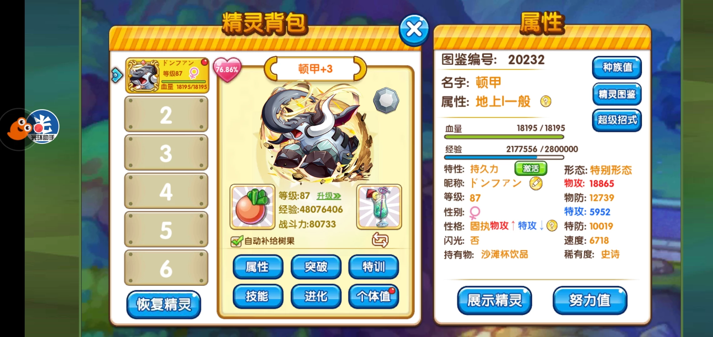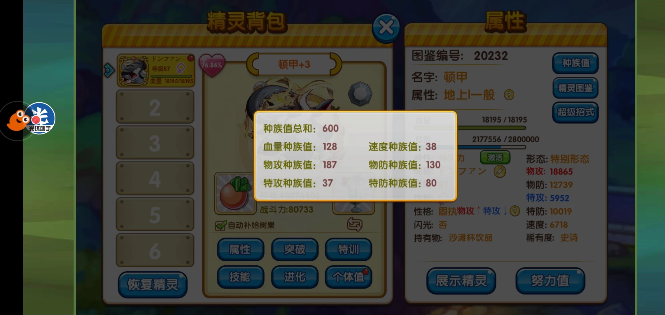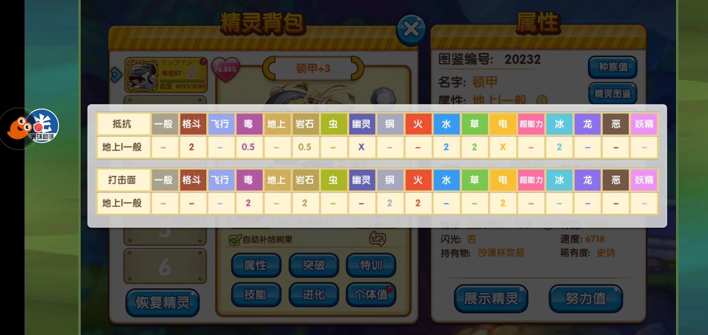 顺便附上顿甲的血攻面板。它的学习面非常宽广,不过即便作为输出宠也是可以,能够集气强化,配合对焦基本绝对暴力,所以在实战中,可以根据队伍搭配,选择合适属性的技能,来给予对手打击,但是限制于格子的原因,其他属性最好选择一个,本系珍藏盲点只有鬼,对钢系和岩石系打击不够,但是其他都是一倍,这就保证了输出能力,珍藏威力140,只要解锁就没副作用,还是非常好用。