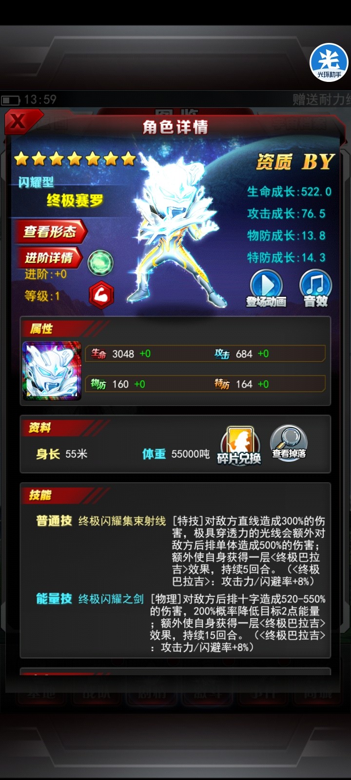 平a终极闪耀集束射线[特技]对敌方直线造成30%的伤害,极具穿透力的光线会额外对敌方后排单体造成500%的伤害;额外使自身获得一层<终极巴拉吉>效果,持续5回合。(《终极巴拉吉>:攻击力/闪避率+8%),平a最好的效果就是单体伤害,如果加上直线伤害,说不定能达到800%伤害,以及自身的buff加成,这两种加成都对自身有极大提高,如果叠加起来效果可以,可能会达到一些不可设想的结果