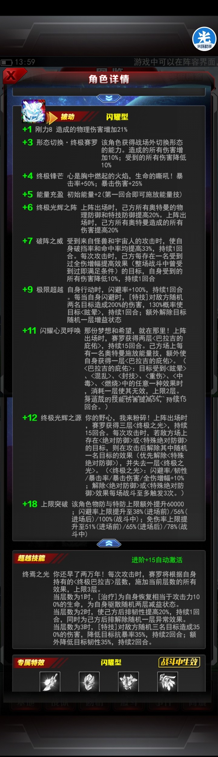 +7被动破阵之威受到来自怪兽和宇宙人的攻击时,使自身破挡率和命中率均提高33%,持续1回合。每次攻击时,己方每存在-名受到过全伤增幅提高效果(整场战斗中曾受到过即满足条件)的目标,自身受到的所有伤害降低10%,持续1 回合,自身的概率提高,伤害受到伤害降低,这就是他的变态