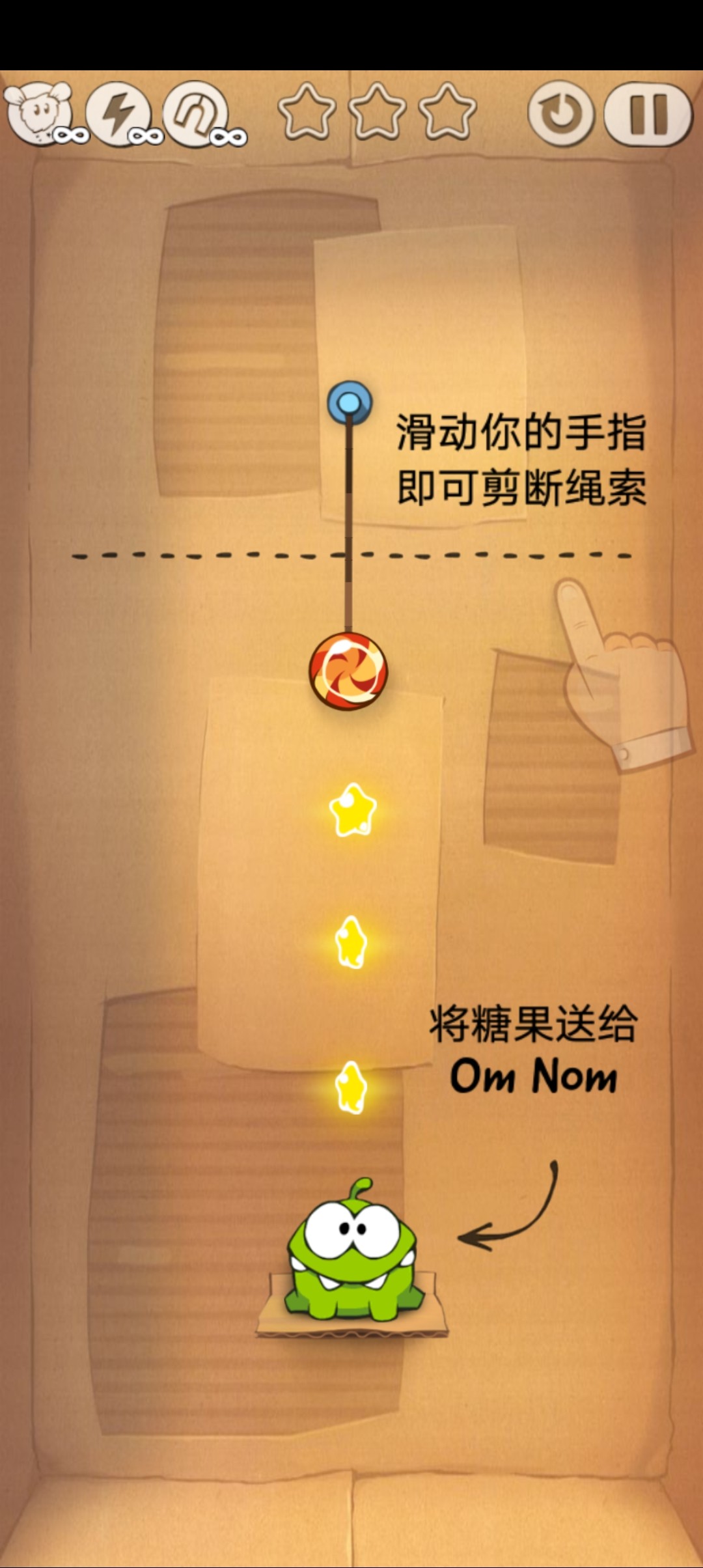 游戏的操作方法很简单,只需要滑动屏幕来进行关卡进行即可。就比如绳子拴着糖果,我们就把绳子割断