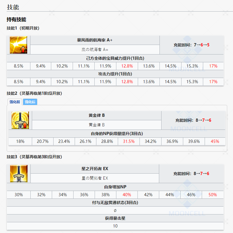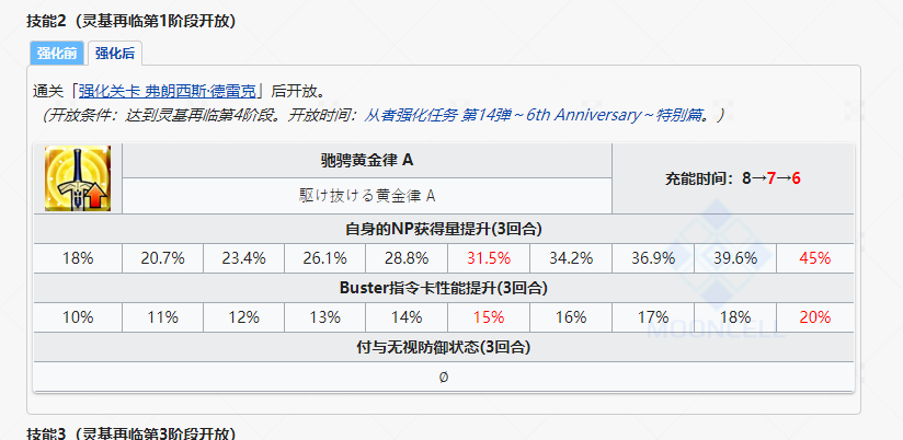 二技能「黄金律 B」,赋予自身18%~45%NP率提升三回合,经过技能本强化之后二技能额外增加了自身10%~20%红魔放三回合+无视防御状态三回合。