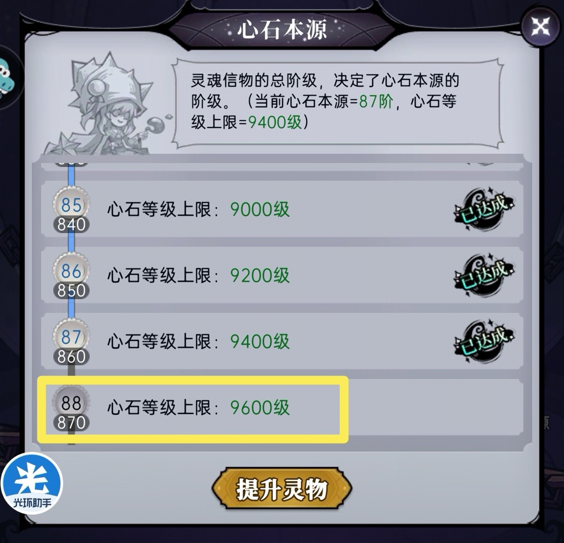 秘灵心石系统等级上限和心石本源等级直接挂钩。心石本源的等级就是你所有灵物小件等级相加,达到要求就会解锁新的心石本源等级,从而提高秘灵心石的等级上限。