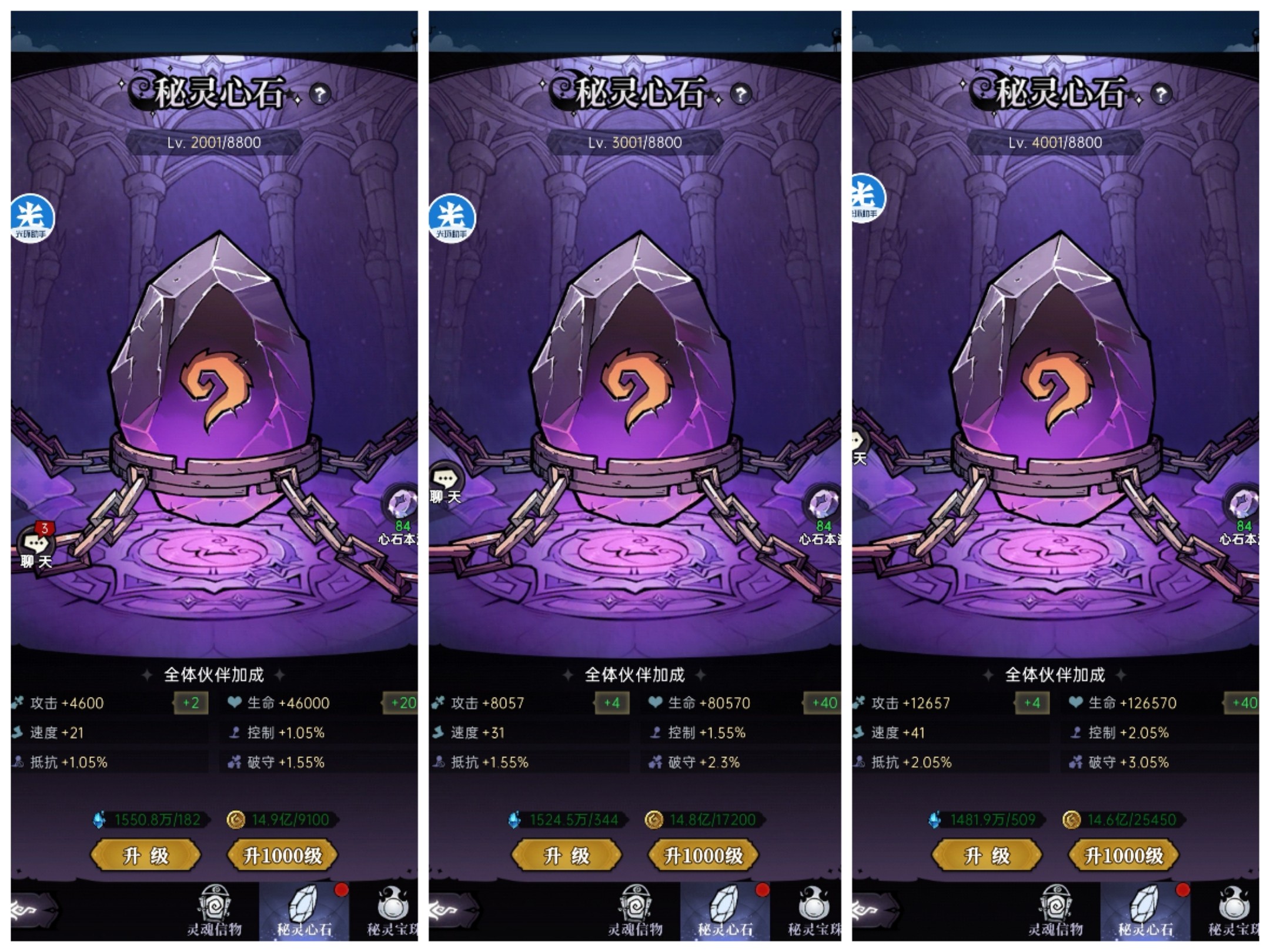 每1000级:提高10点速度,提高0.5%的控制和抵抗加成,提高0.75%的破守加成。(攻击和血量加成不固定,会随等级变化增加)
