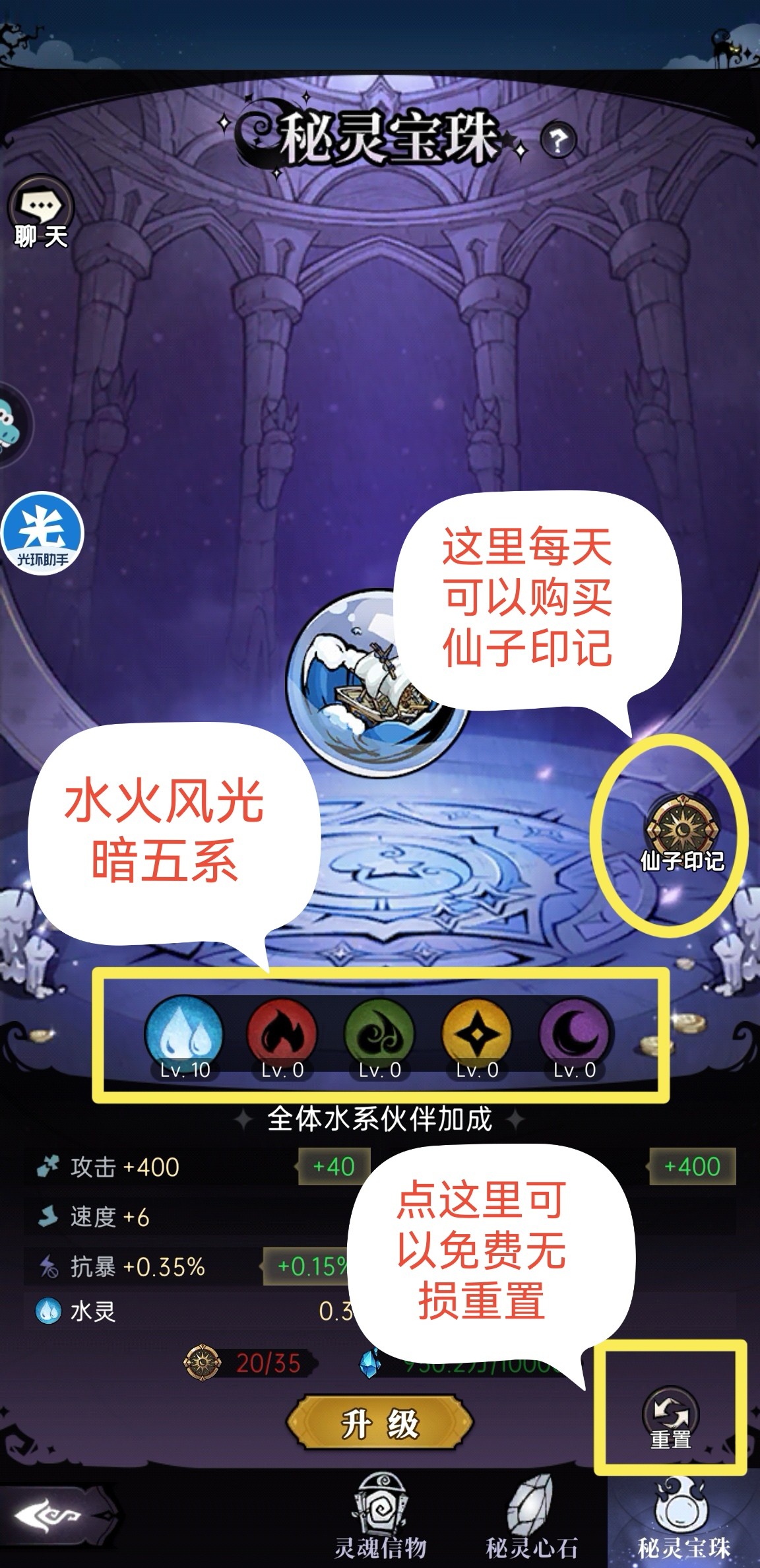新灵物系统由【秘灵心石】和【秘灵宝珠】两个子系统组成。秘灵心石可以给全体伙伴增加属性,消耗灵物圣徽和灵物神石;秘灵宝珠分为水火风光暗五系,可以给单系伙伴增加大量属性,并且有新的同系羁绊,消耗灵物神石和仙子印记(新的氪金道具)。