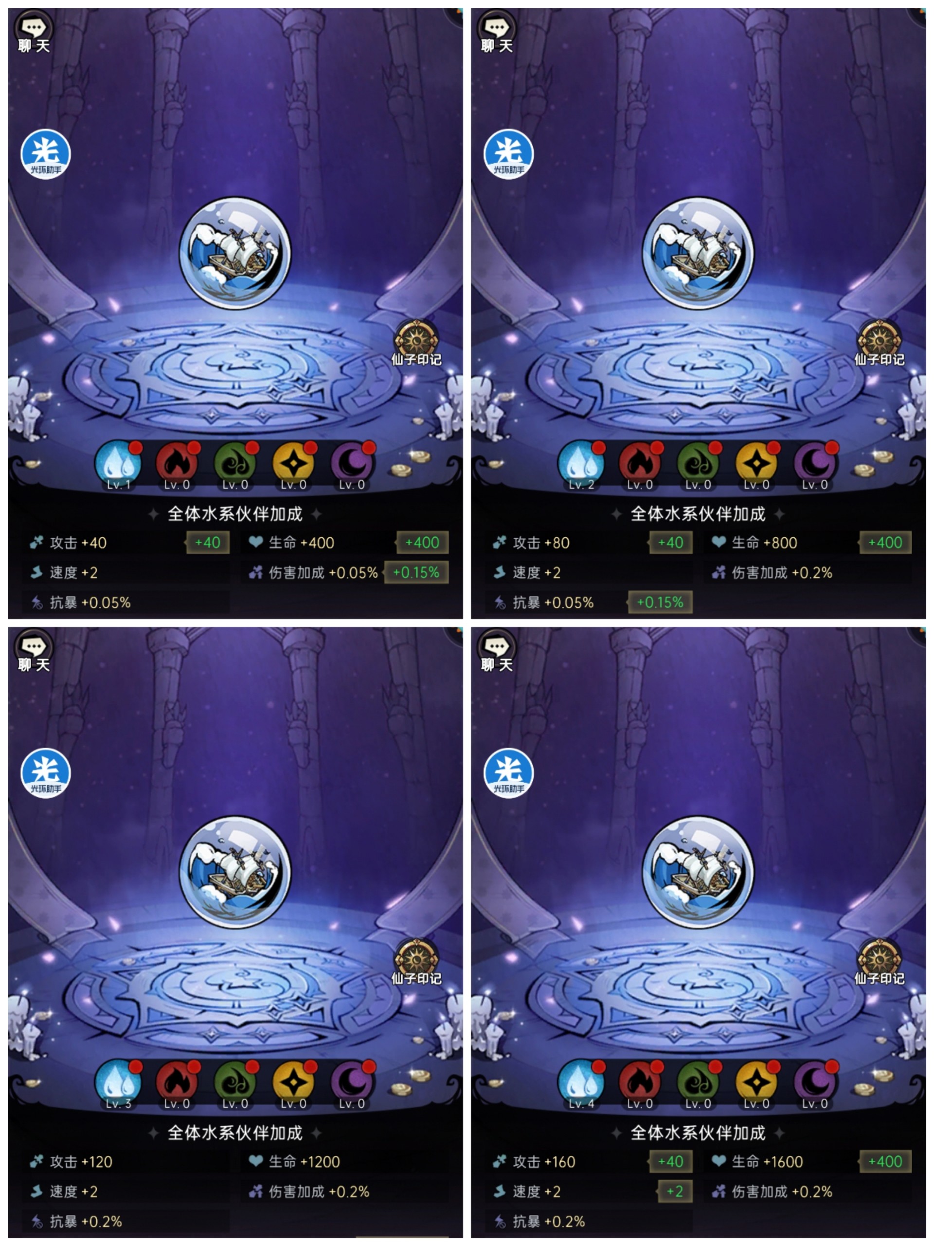 每升4级一个循环。+2点速度,+0.15%伤害加成,+0.15%抗爆,+0.15%振奋。(随等级提升加成是否会有变化未知)