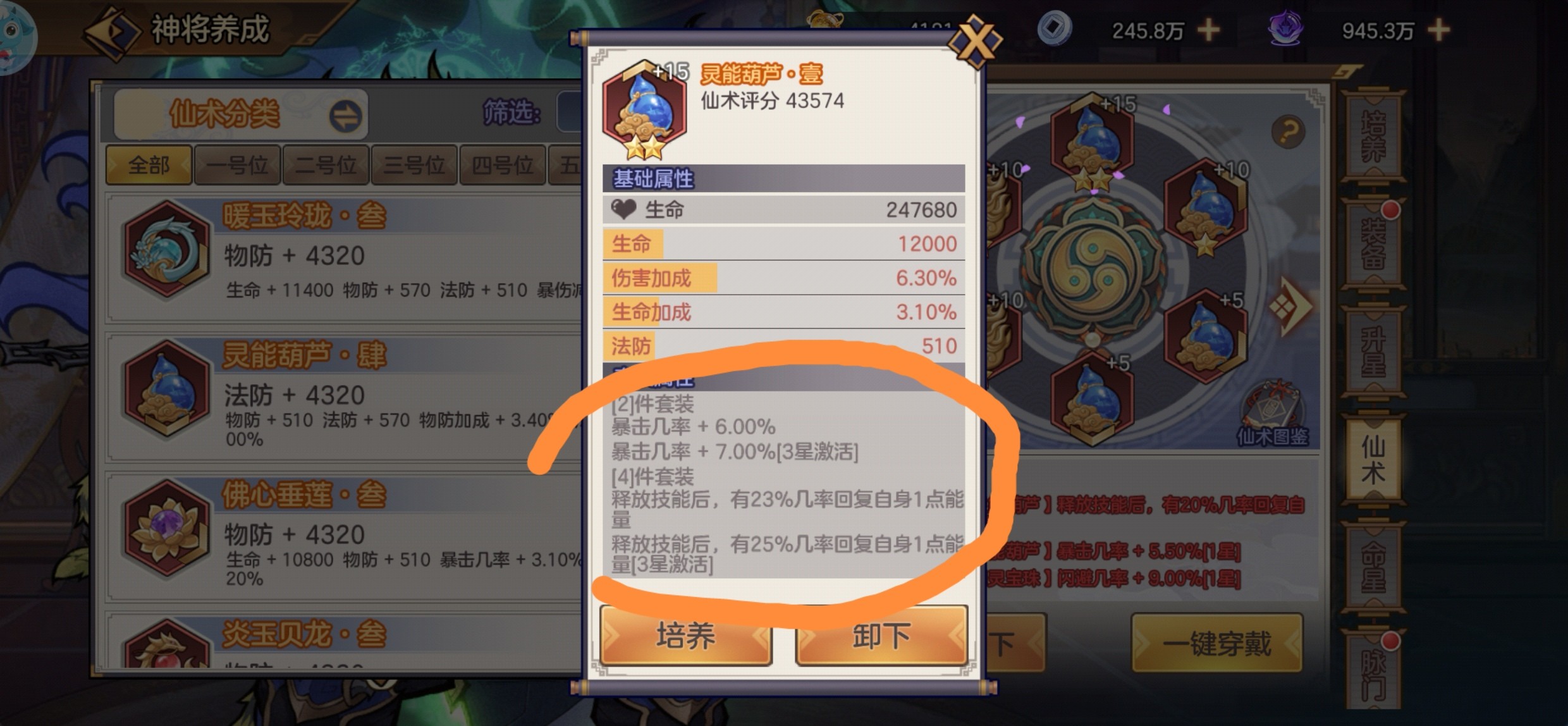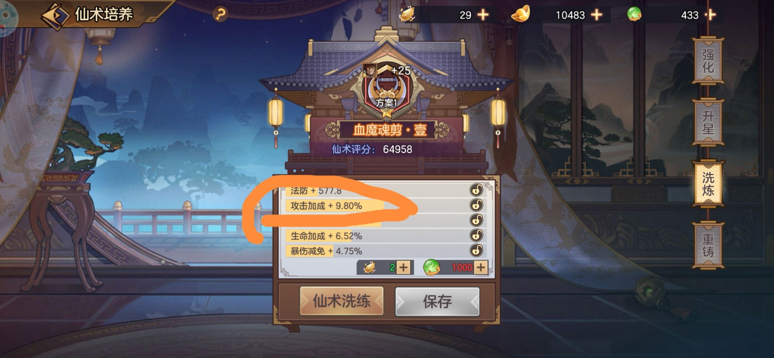 ★这里重点说一下:仙术副词条的锁定,是在这条属性满了以后在锁定,这样就不会在洗练的过程中又把它洗低了。同时这条副属性也必须是你想要的,而不是乱洗。