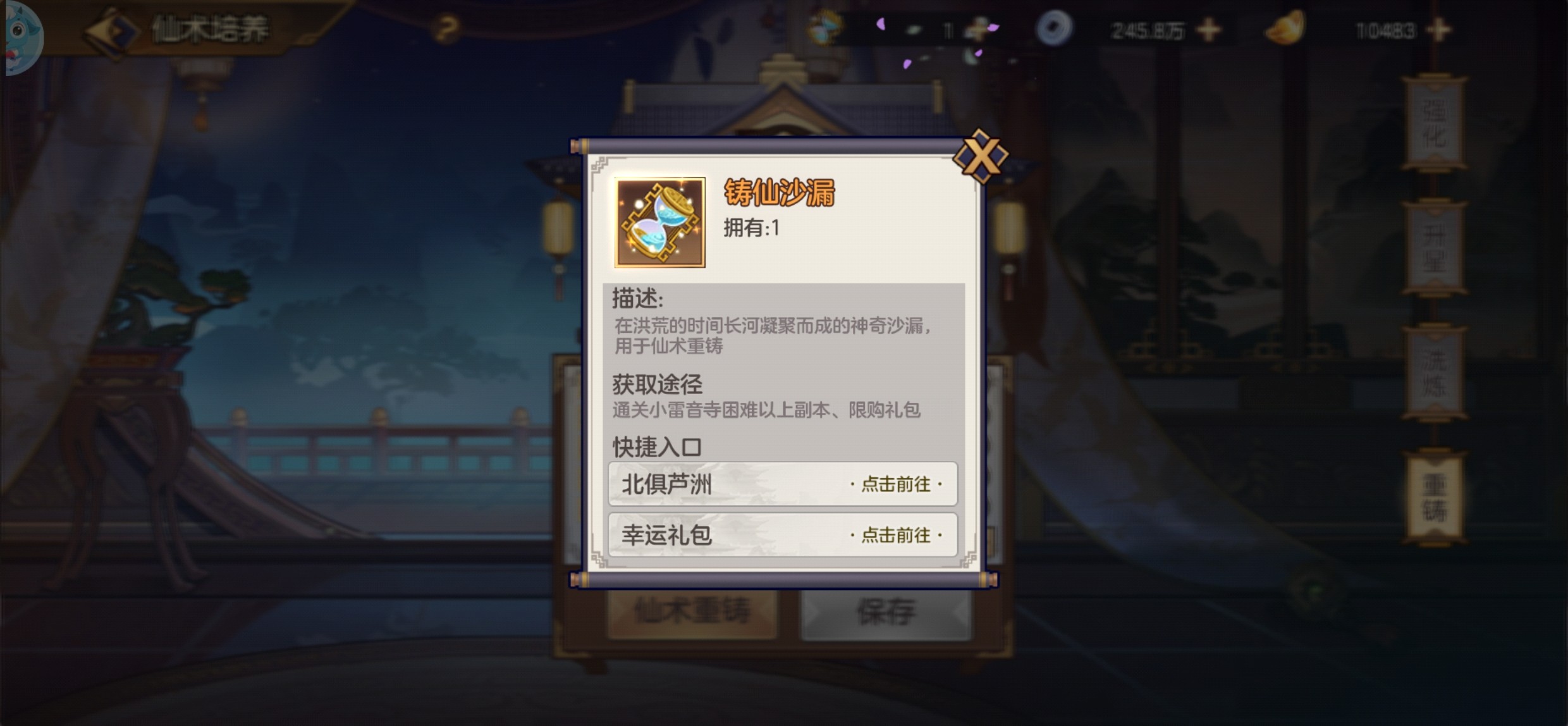 仙术重铸需要花费2个铸仙沙漏以及一些银币。