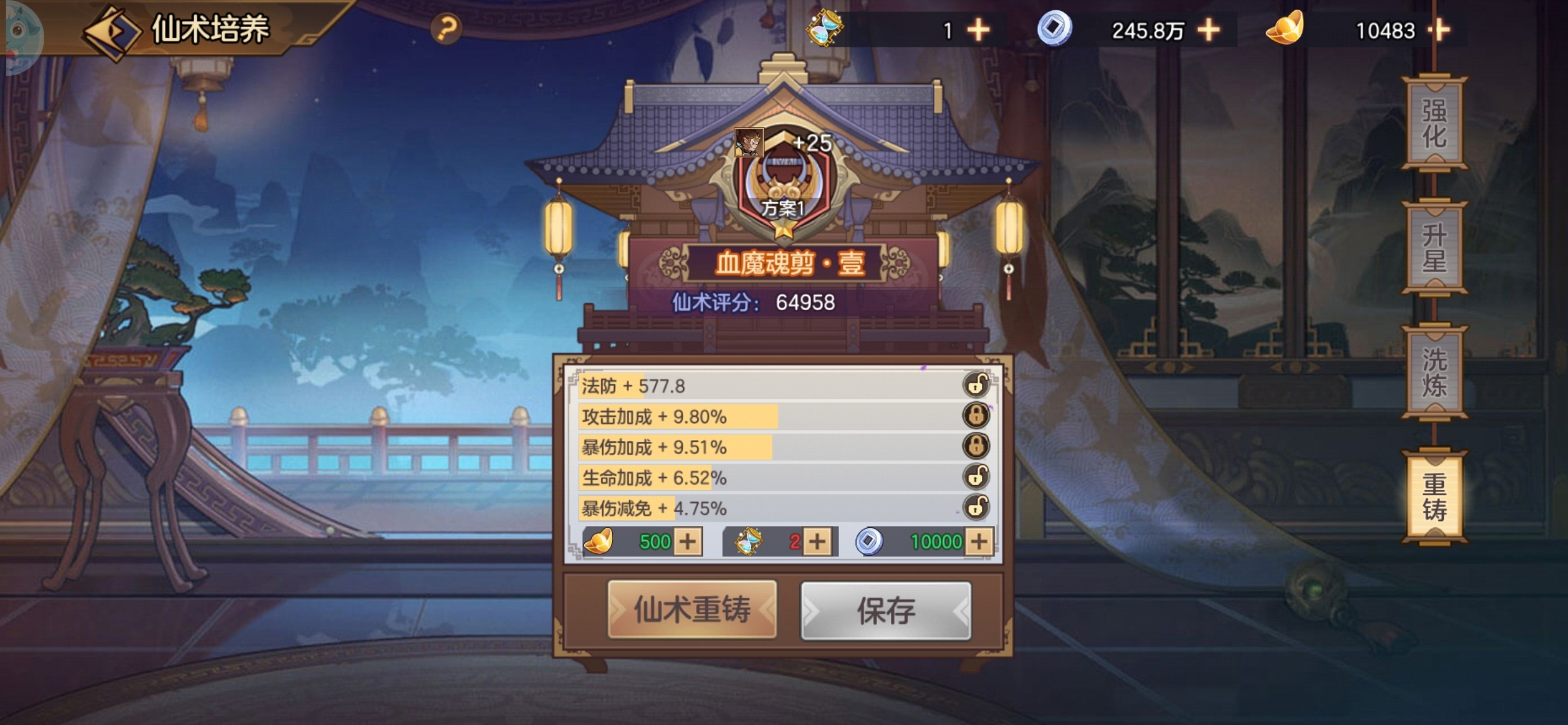 仙术重铸的时候可以进行锁定,花费元宝进行。这里提醒小伙伴,当重铸到自己想要的副属性的时候,一定要进行锁定,不然会后悔莫及。