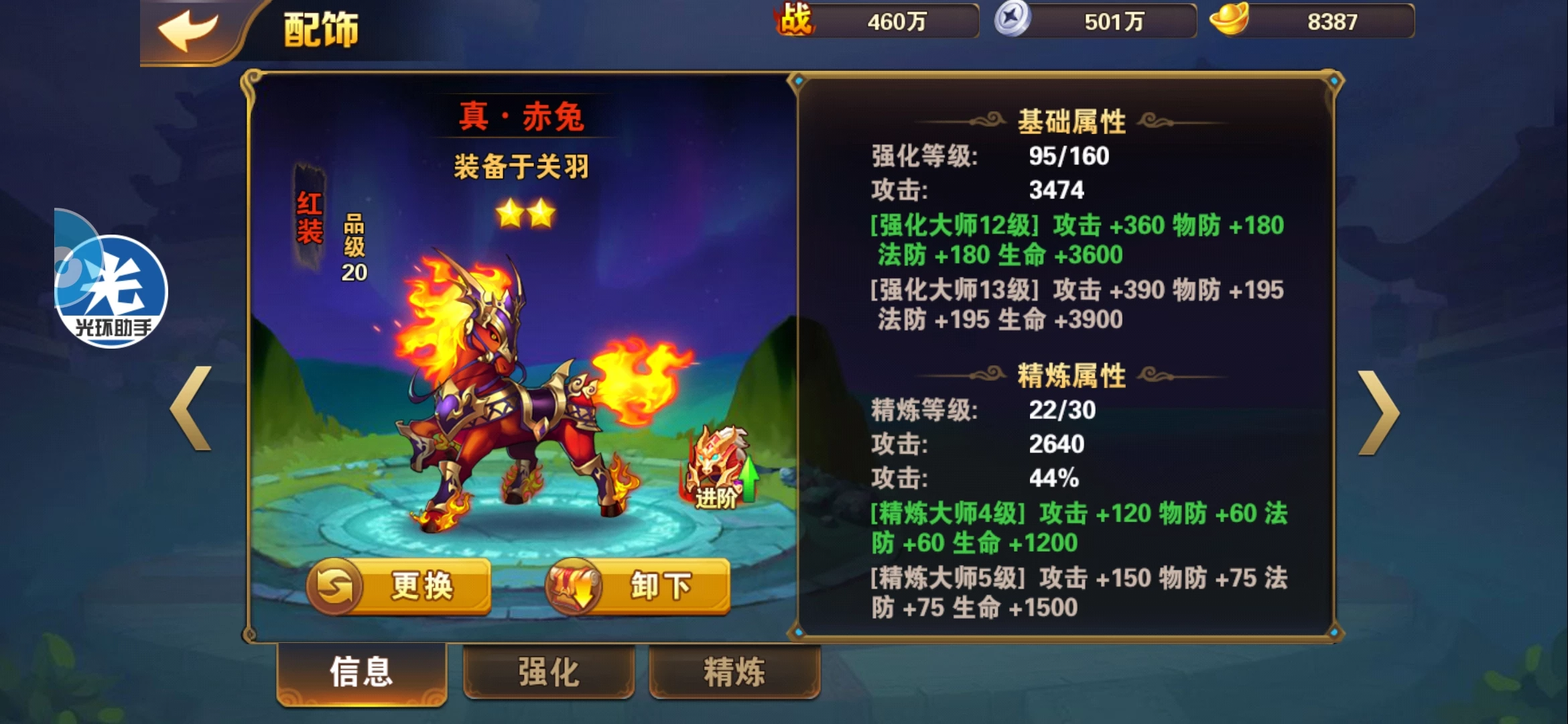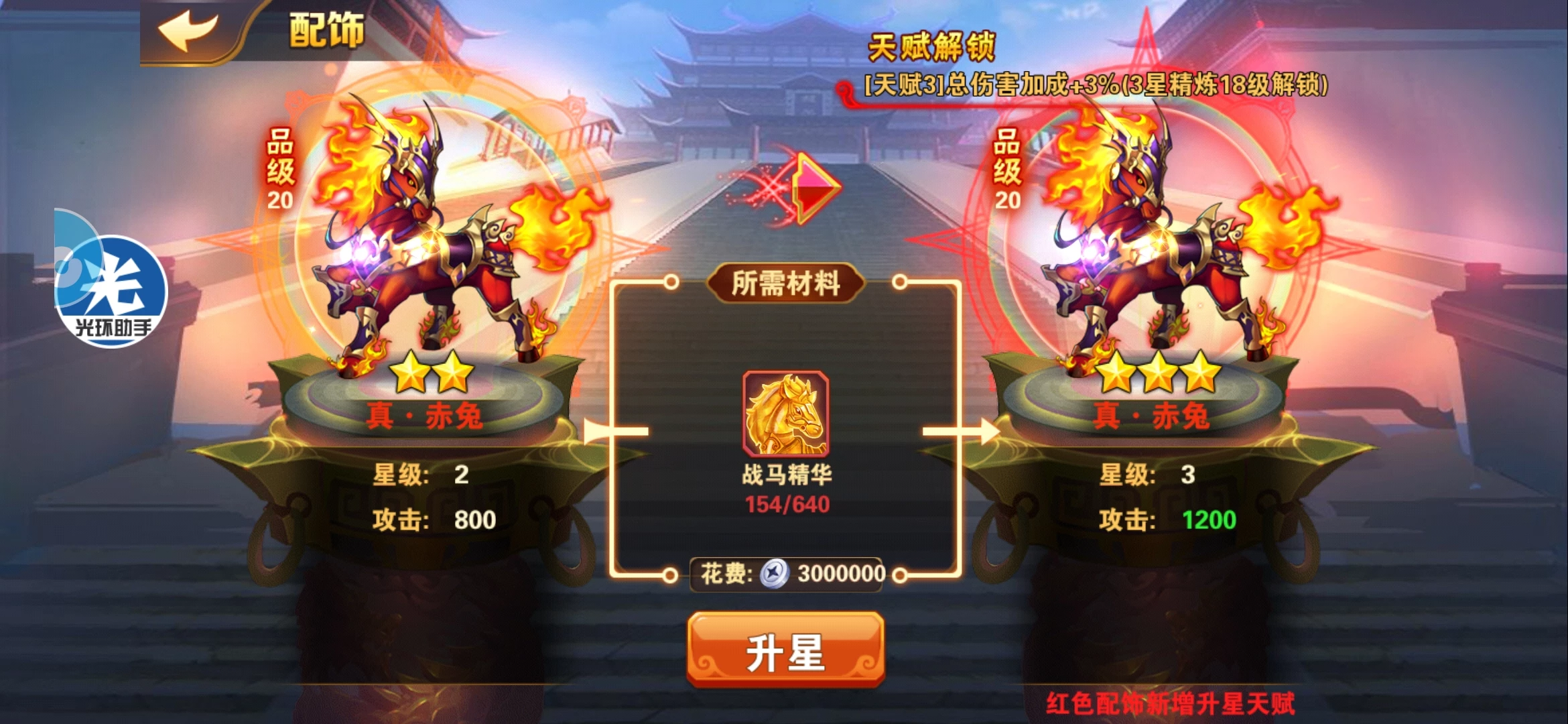 对于配饰升星这一块,一般偏重的都是马。都是优先把马突红,优先把马升星,毕竟所有属性里面攻击属性是最好的。
