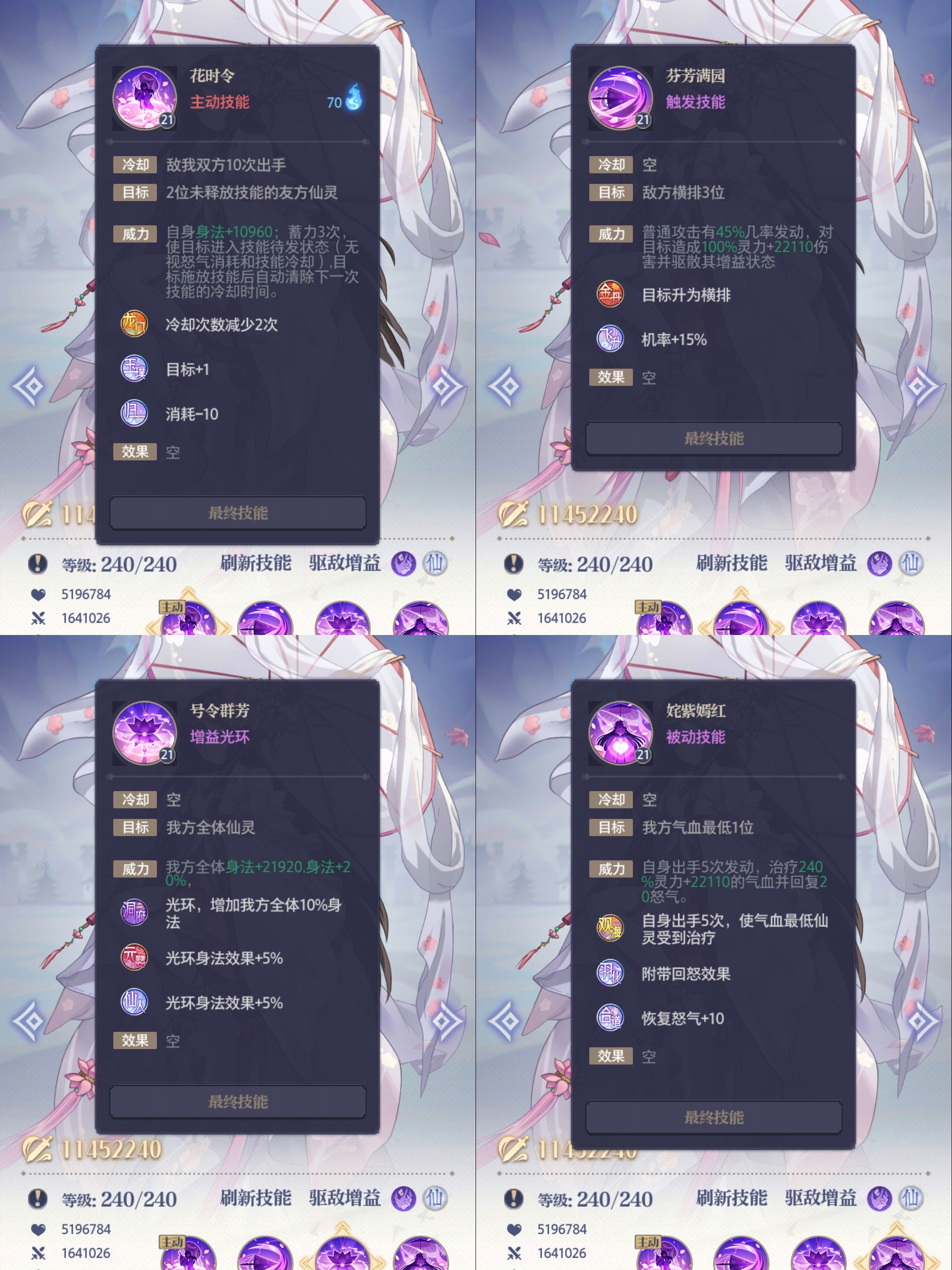 百花仙子的四个技能还比较全面,主要是辅助队友释放技能,增加身法buff和怒气,唯一的不足可能是缺少控制。但作为一个团队辅助仙灵,百花仙子肯定是顶级人物。