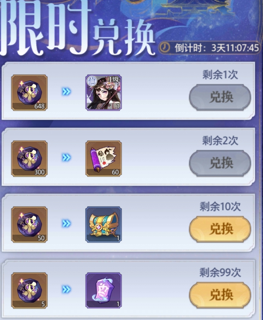 在任务这一栏,完成全部任务好像也无法在限时兑换到本期主角百花仙子,毕竟是氪金活动可以理解,但我们可以兑换 一名铸魂仙灵碎片。