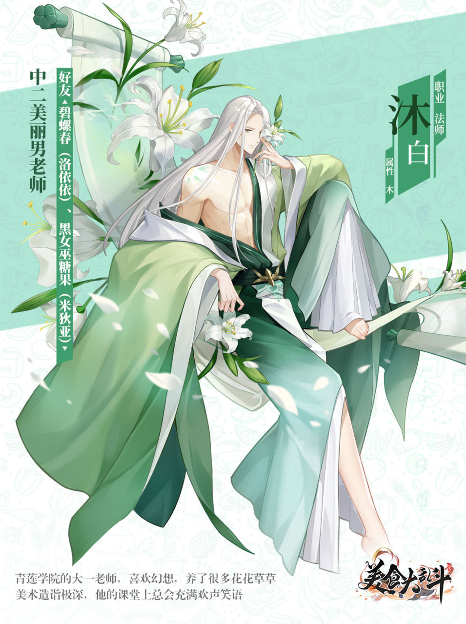青莲学院的大一老师,喜欢幻想,养了很多花花草草,美术造诣极深,他的课堂上总会充满欢声笑语。