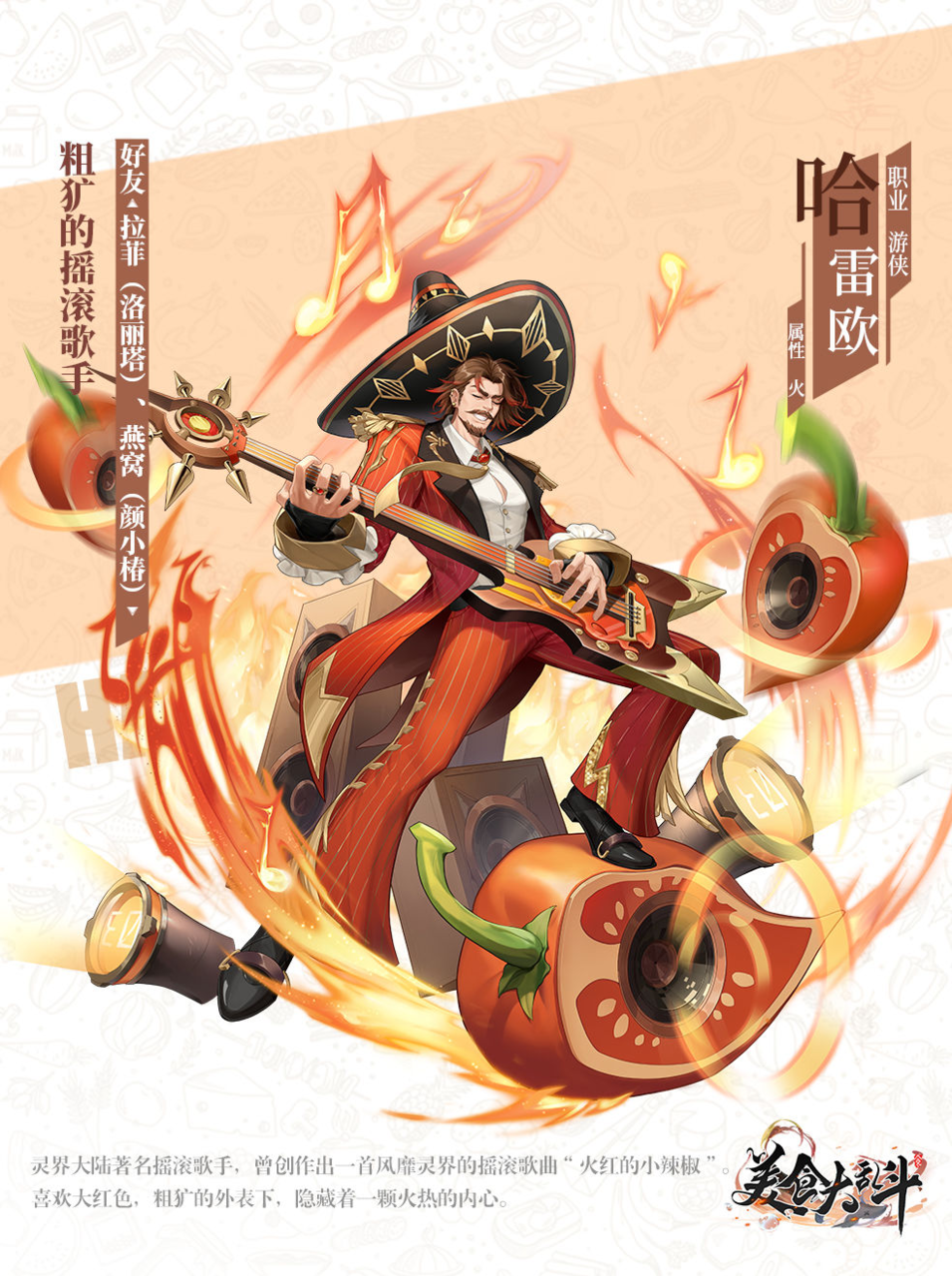 灵界大陆的著名摇滚歌手,曾创作出一首风靡灵界的摇滚歌曲“火红的小辣椒”。喜欢大红色,粗犷的外表下,隐藏着一颗火热的内心。