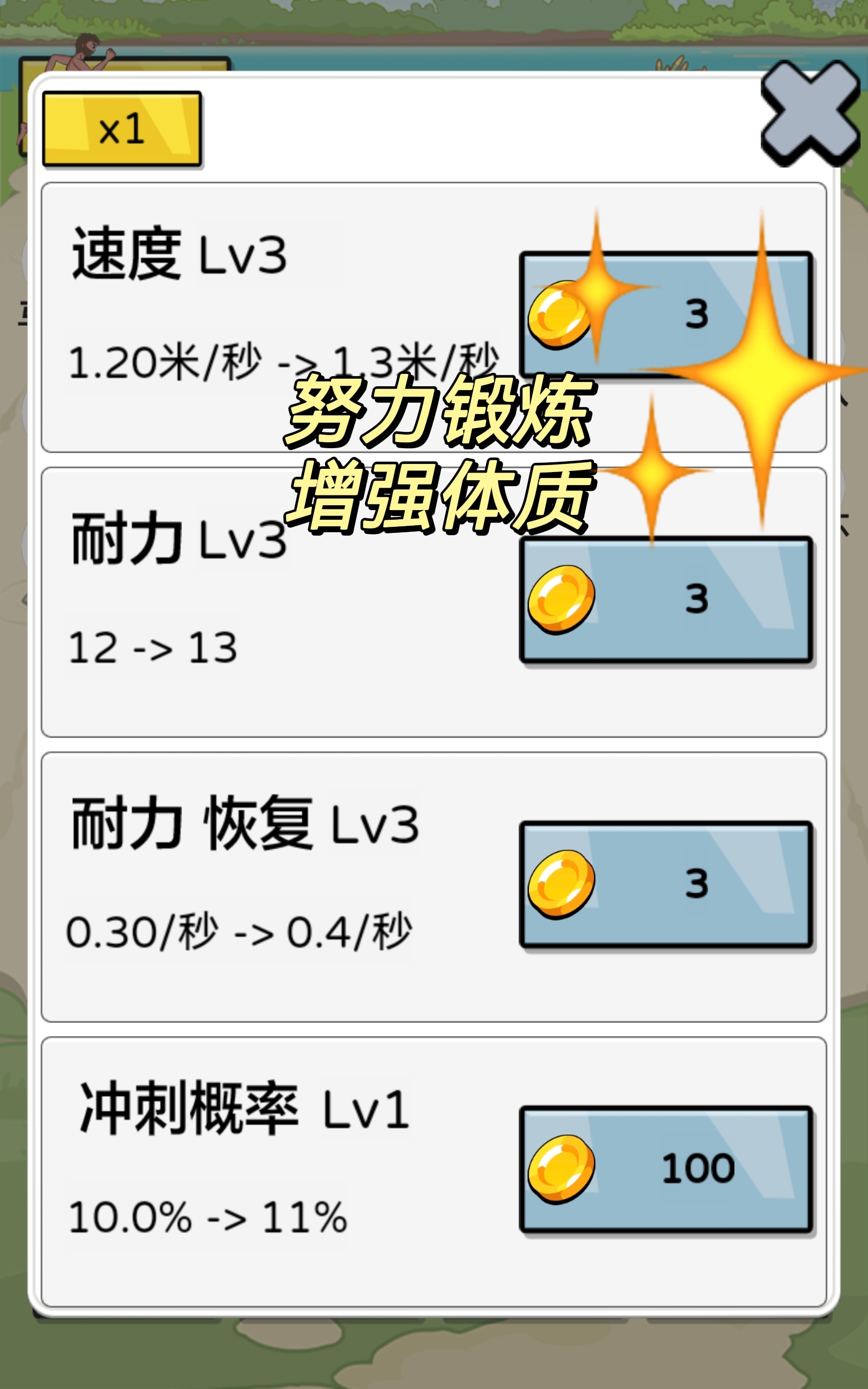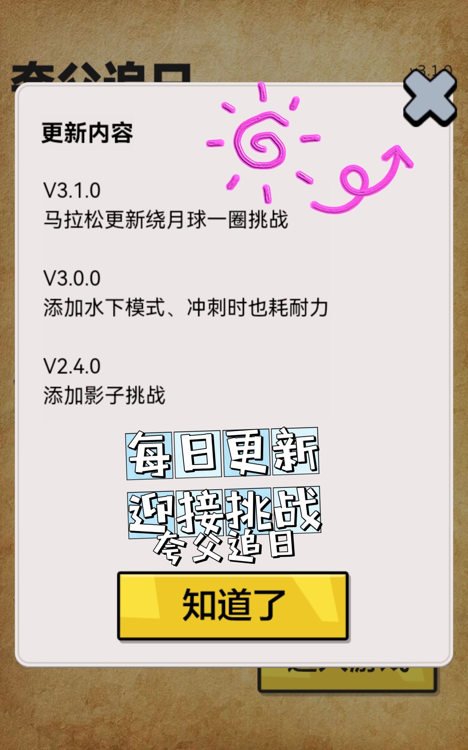 首先这款游戏会不定时地更新新的内容✍️,能够给予我们不一样的体验👏,并且呢我们在进入游戏主页后还可以通过我们操控🌟(持续点击屏幕)✌的人物✊(夸父)在跑步机上进行奔跑👣,进而获取金币💰,我们则可以通过金币来提升我们游戏人物的速度、耐力、以及冲刺极限等💞🎉。