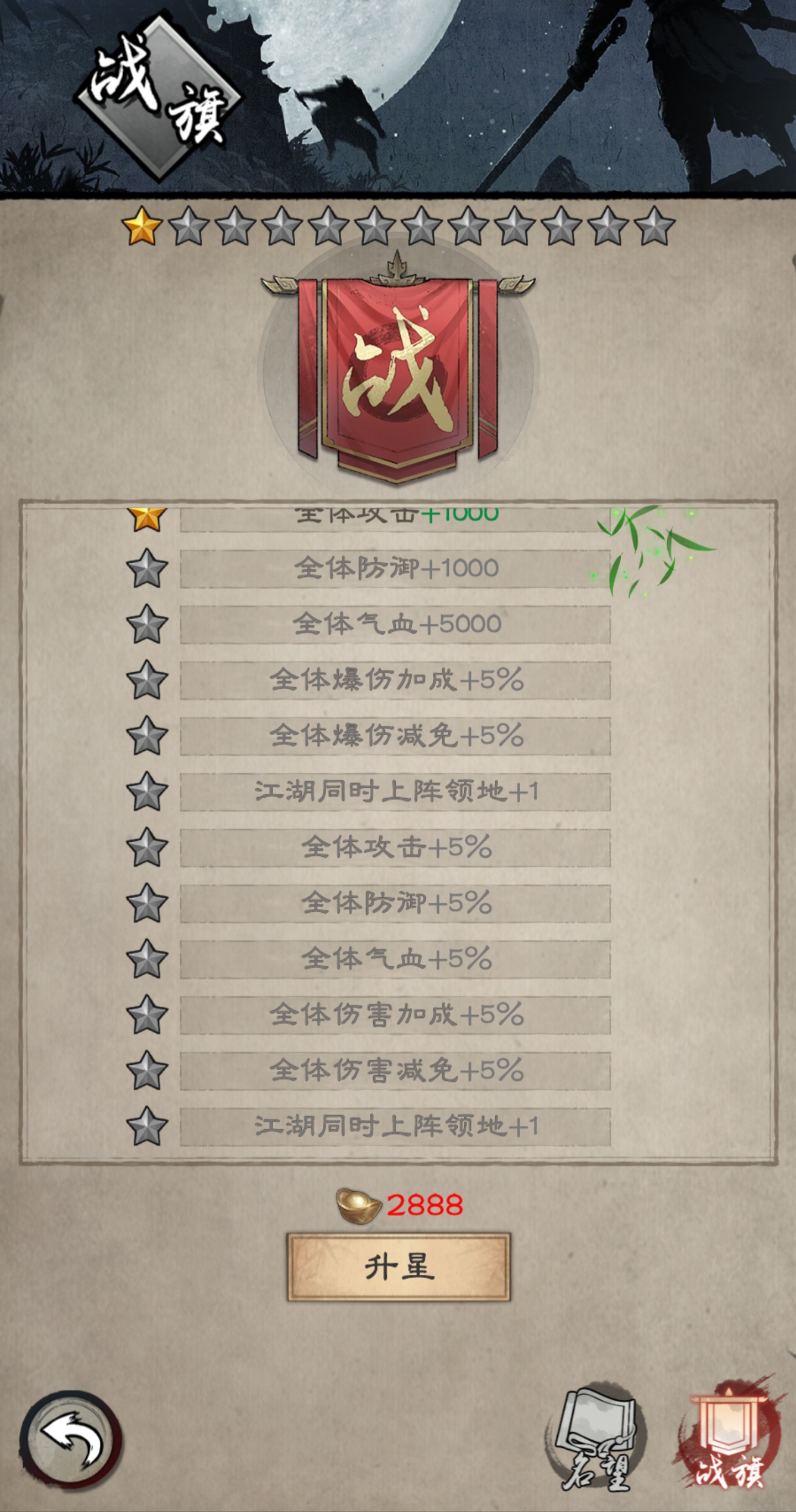 说实话,这种加成权益很难不让人心动。又回到了老生常谈的问题,即怎样使用元宝得到最大的收获权益。现在,答案显而易见,无脑升级战旗就完事了,你还在为1500元宝抽取到的紫品低级功法而苦恼吗?你还在为元宝不能直接抽取人物而愤愤不平吗?那么,我告诉你,优先将战旗生至6星以上,就是对战力的最好提升。所以,吾辈们,不要在想我一样肆意的挥霍元宝啦!有了目标,就有了攒元宝的动力!我也在次说明:先把战旗系统毕业,元宝不再用作其他用途!加油!游戏加成培养优先级:全体伤害加成(减免)>全体爆伤>全体攻击(防御.气血)。记住百分比的加成才是最划算的!重要的事情说三遍!