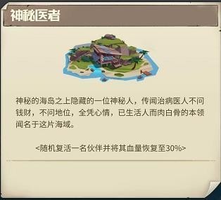 神秘医者:前往含有神秘医者的海岛可以随机治愈一个阵亡的伙伴并恢复全部生命值,如无阵亡伙伴则随机恢复一个伙伴的全部血量。