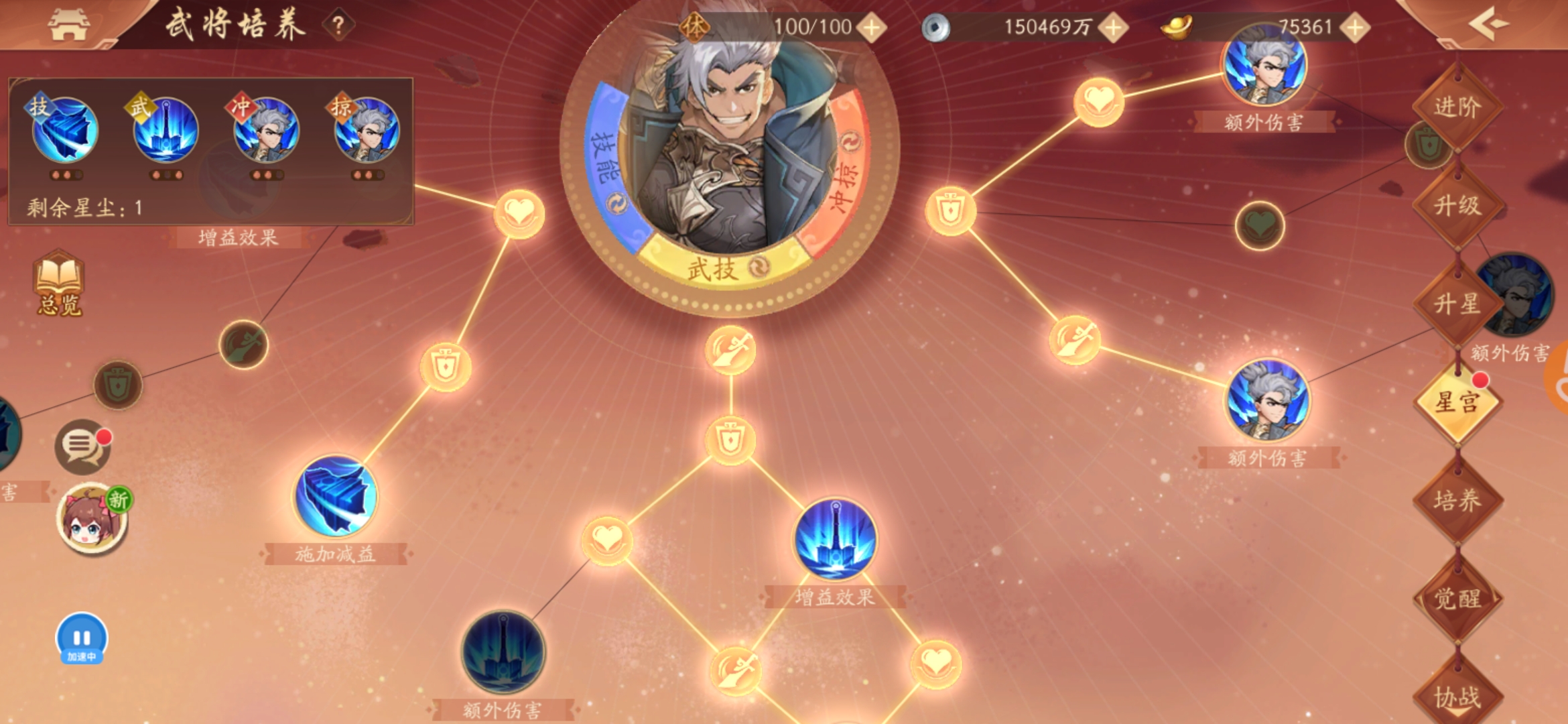 之前有人问过武将强度排名,在此给出我的个人看法,由于当前版本神兵战法的强度,武将强度排名:许褚≥黄盖>马岱≥颜良≥徐晃>张飞/孙策>马腾,许褚当前版本t0强度,冰城鼎,天金装备选择幻化暗,6星 星宫如下图点法,满星点满左边就行,护盾闪避流的许褚;黄盖不用多说,混国必选,辅助能力强;马岱白板强度挺高的,后面高星是不如许褚和黄盖了;颜良数据太少了,虽说有成长性,但是似乎不强,不比当时赤金2的左慈了,徐晃强度天金1一贯绝尘,其他三个不比徐晃,徐晃的护盾配合许褚,强度高。国家队中,群国暂时弱了点,魏国和吴国这个版本蛮吃香的,蜀国比群强,当前版本还是三天金带两个赤金好用些,赤金是炮灰,能快速触发周瑜的东风和增加战团值。