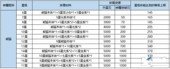 熊猫属于SSR神魔,所以在升星上除本体外还需要光系狗粮。所以大家在日常培养中一定要时刻留意积攒光系狗粮,下面附上熊猫每个星级升星所需材料: