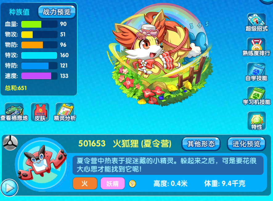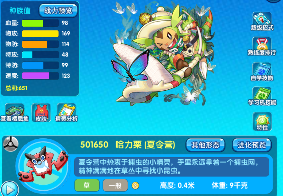 技能搭配强化输出流:过热、萤火、月亮之力、打草结,性格:胆小,努力值:速度特攻,道具:剩饭、火把,特性:技巧达人