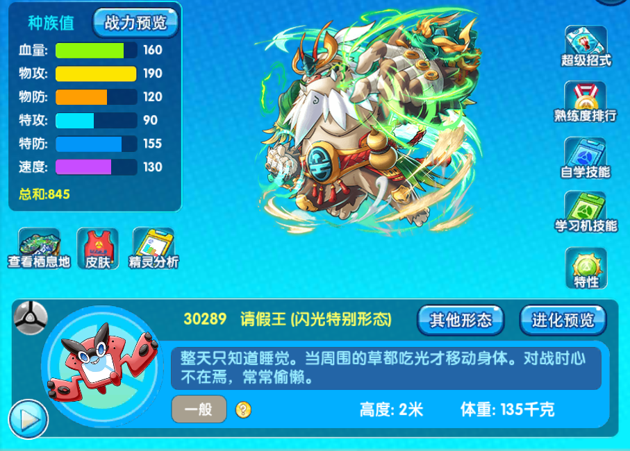 偷懒特性可以解除状态不过有一个很大的条件,就是要必须使用变化类技能,这两种输出技能搭配看起来都是一模一样的,只是强化条件,有快有慢,如果想要快一点,可以使用暴击输出流,如果想要一点一点可以使用强化输出流,大力巴掌,这是新的一个专属技能自身的血量越高,威力越高,满血最大威力可以到达150,如果使用胆量特性,就可以避免被幽灵属性宠物随便联防的尴尬了,但是缺点就是比较害怕状态,如果使用偷懒特性,就必须要使用灭气掌、不仅仅可以回血,也可以针对幽灵属性的宠物,所以说请假王都是一个非常不错的宠物