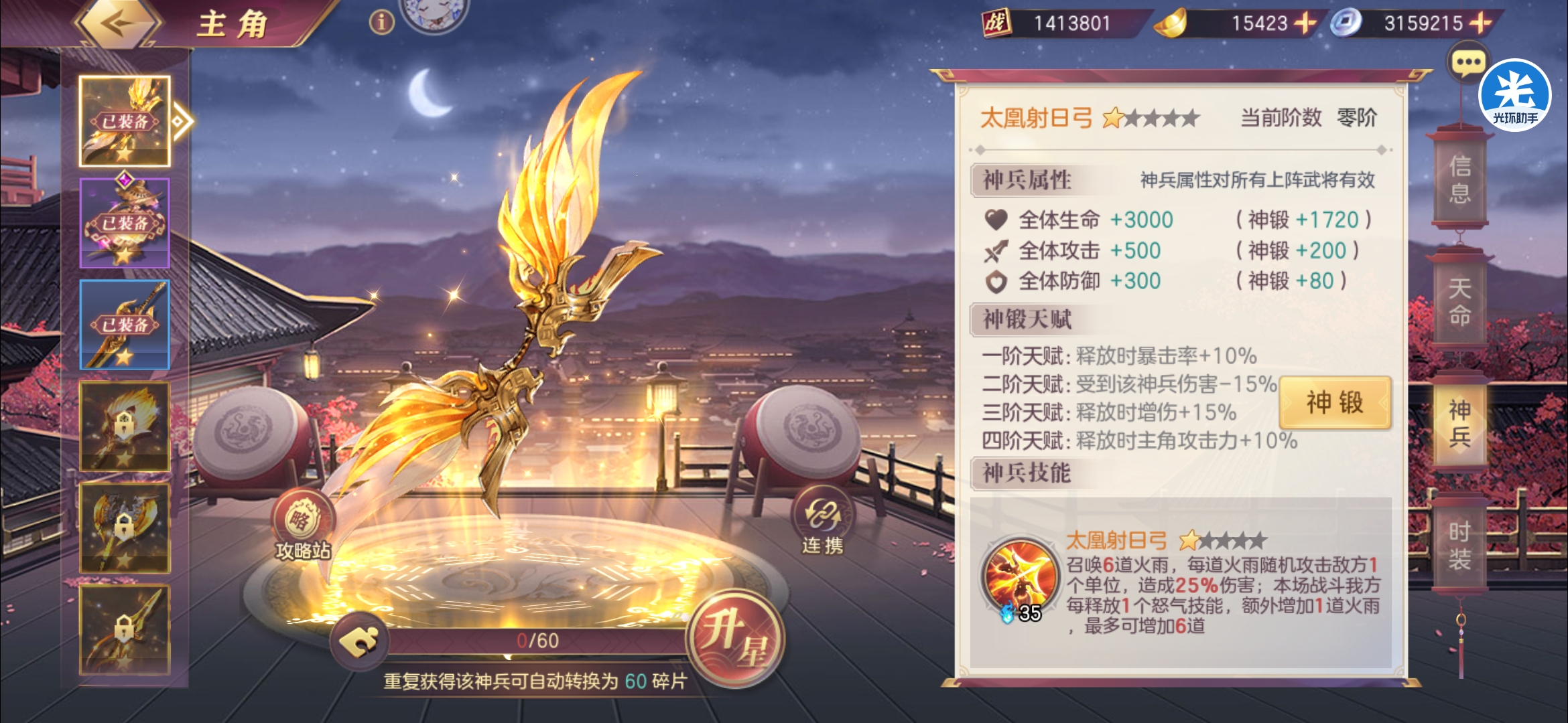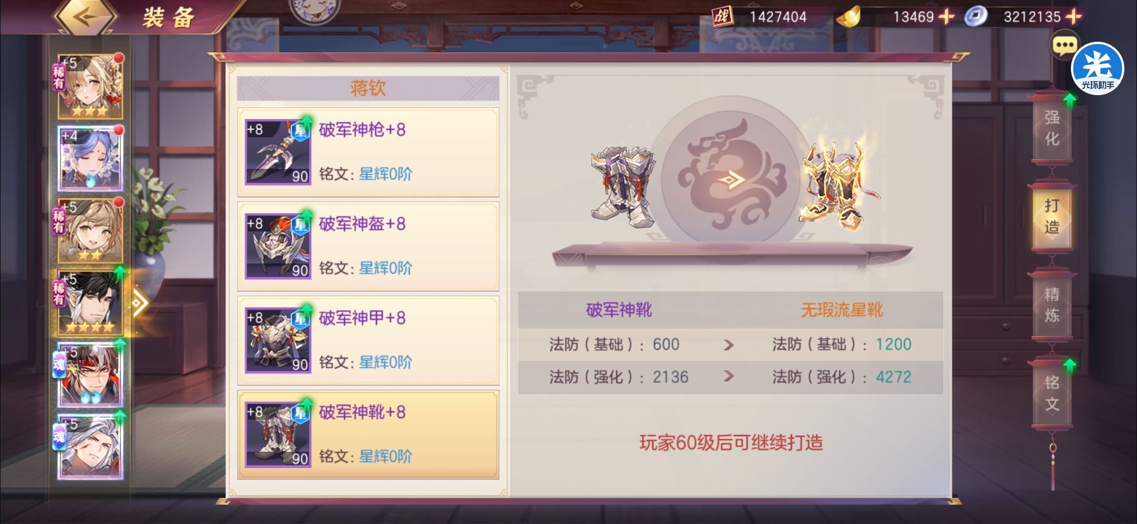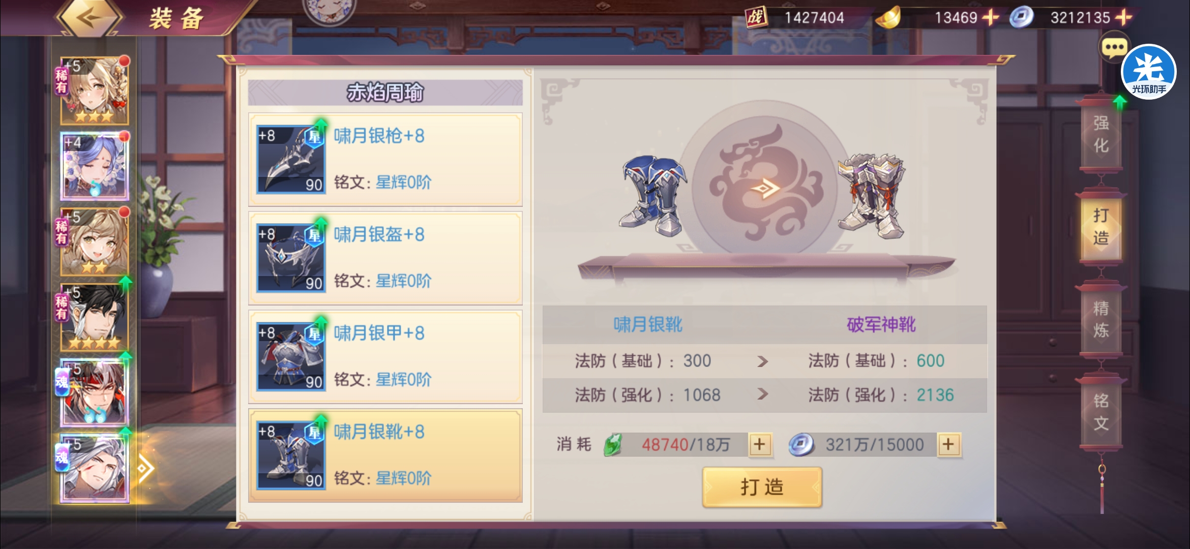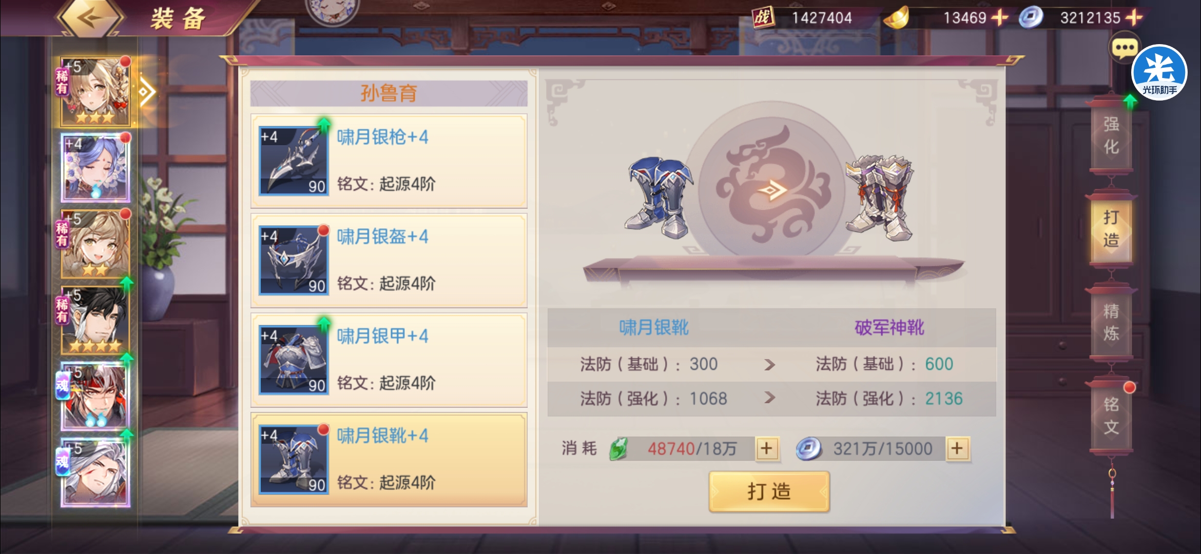 应该优先把煊明孙策的一套装备打造紫色进阶+12并且铭文刻印到月,我这里没太注意,之后再补吧。