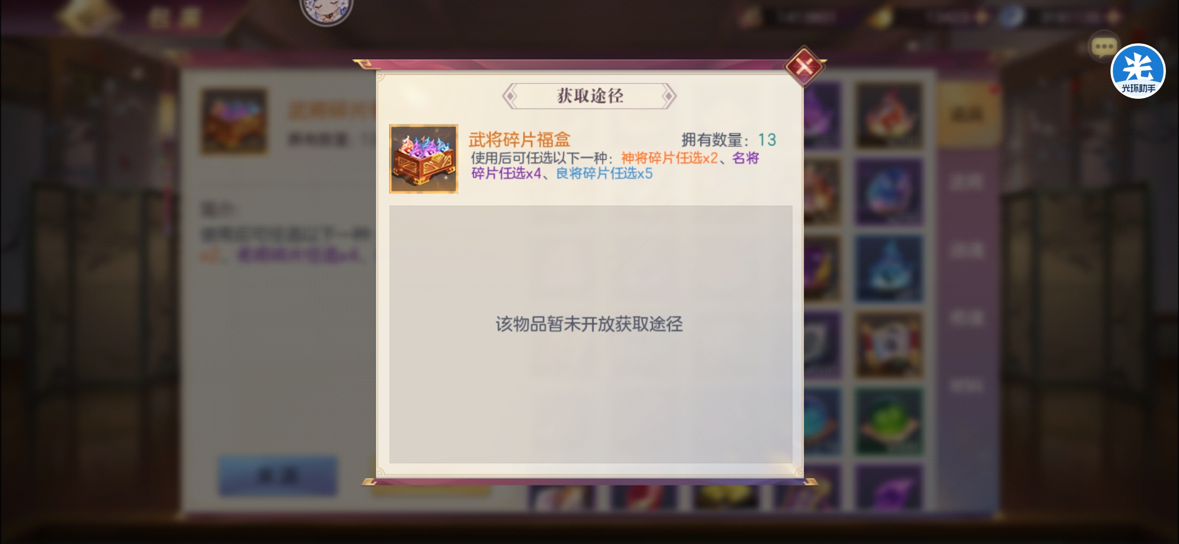 所有的蓝紫色碎片都不要用包括这个武将碎片福盒,我们要留到二十多天补时装的点数,提前用了只能把全部元宝拿去抽卡,这是非常不划算的。