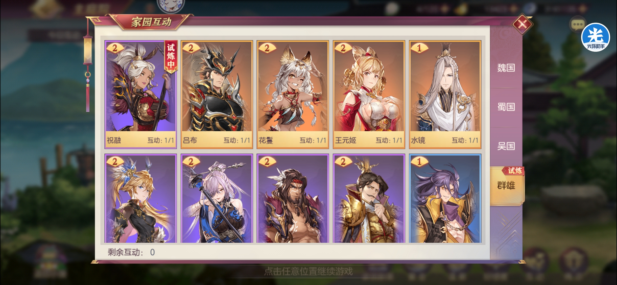 互动次数,好感度礼物优先用于完成试炼任务,满足武将提升品质的条件。