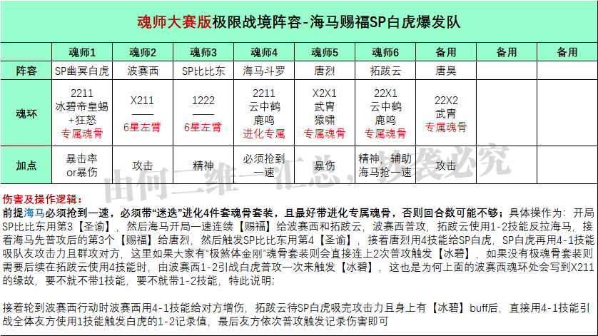 最后的速度属性也是相当重要,不管大家用的是何打法,总体来讲抢一速还是非常有必要的,因此例如上述维一提供的打法,海马是必须在拓跋云的精神2-2被动辅助下拿到一速的,拿不到这个打法就实施不了,因此大家在选择速度属性的时候注意卡一速即可