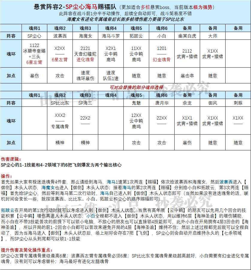 另外针对SP千仞雪武魂真身上线后的伤害对比,维一可以负责任的告诉大家,同样红色5星练度下的SP千仞雪和SP尘心,同样带10万年暴伤魂环+【冰碧】+【三头】,SP千仞雪的武魂真身在达到彩色3星的前提下时,依然无法在长图多桩副本中超出SP尘心的赐福流队伍,这点维一是经过了多天且不同天气的多次对比而得,而且两个队伍差的不是一丢丢的差距,所以大家目前还是放心练SP尘心即可,他依然是长图多桩副本中的No.1 Pick。