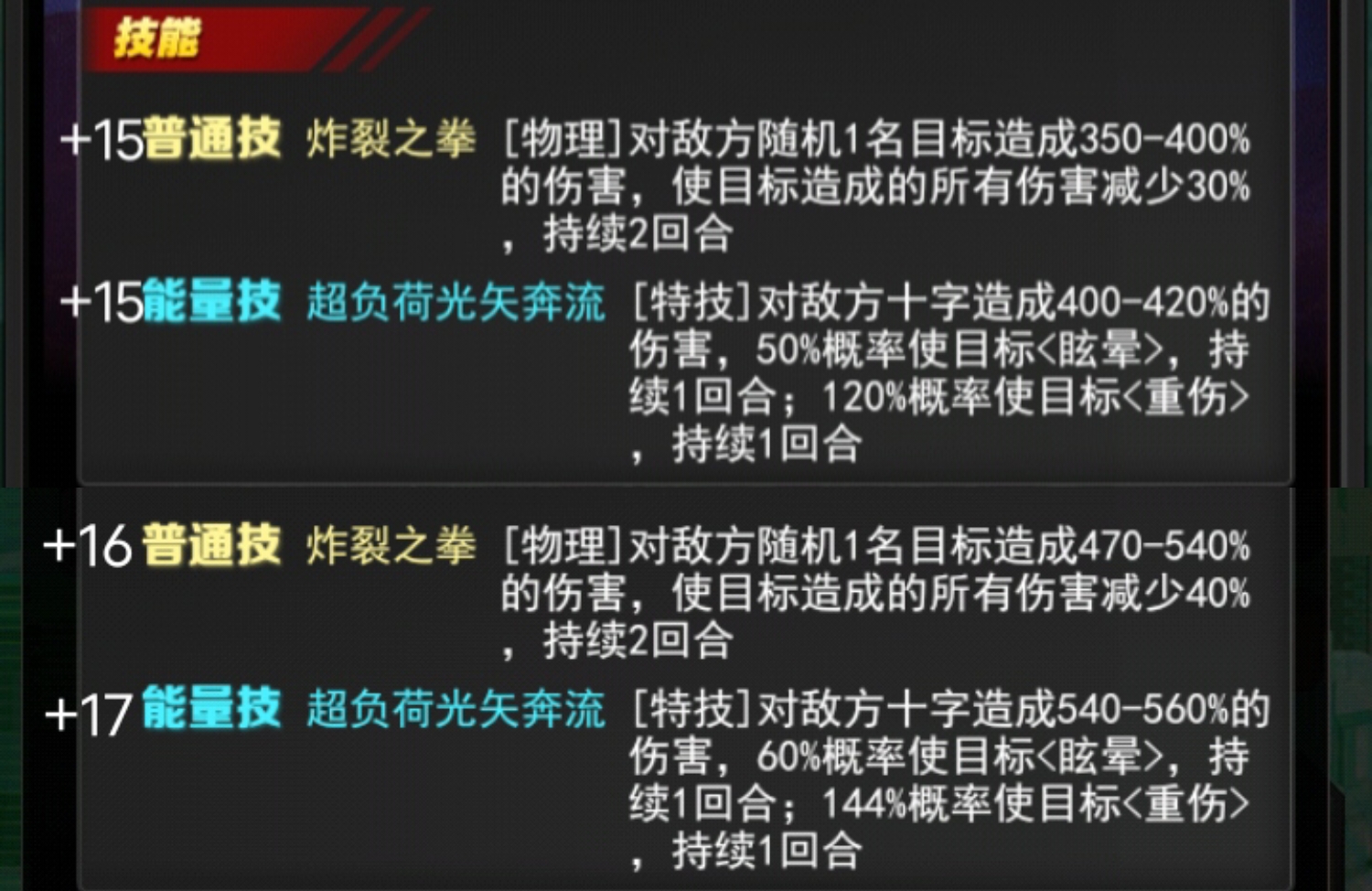 能量技能解析:十字中高比例伤害,这个如果毕业的话可以放两次大招,这个伤害就比较炸裂搭配阵容和被动把伤害拉满实战秒人很不错如果能打的到闪避卡秒了也不在话下,中等概率眩晕高傲概率也重伤这个还行,但是由于毕业之后大招就会被封掉所以眩晕用处也不大搭配献祭爆伤被动打超高伤害