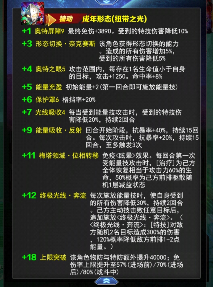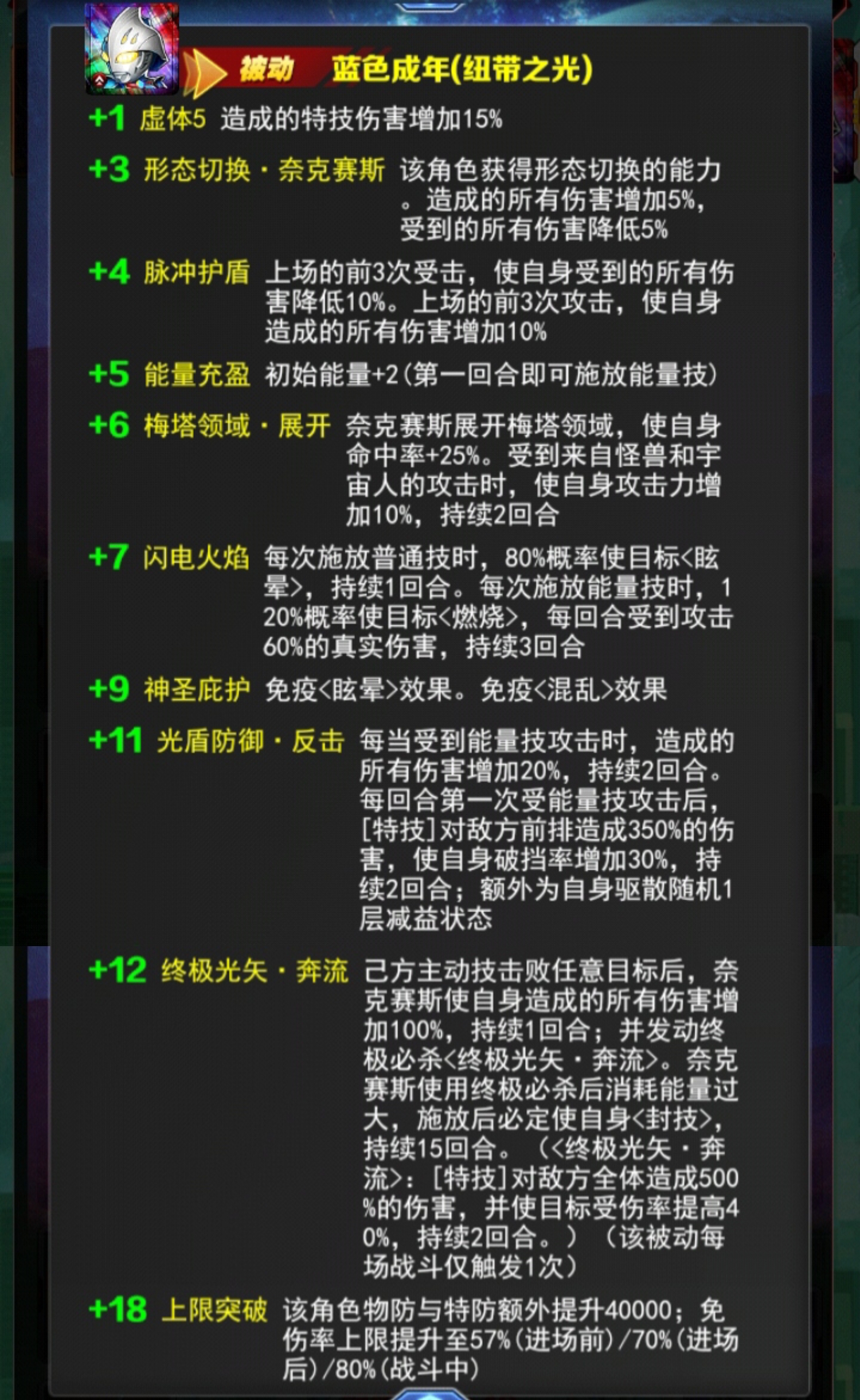 +15 能量技 梅塔领域[特技]对敌方全体造成300%的伤害,使己方全体暴击率增加30%,持续3回合;额外使己方全体造成的伤害增加30%,持续3回-合