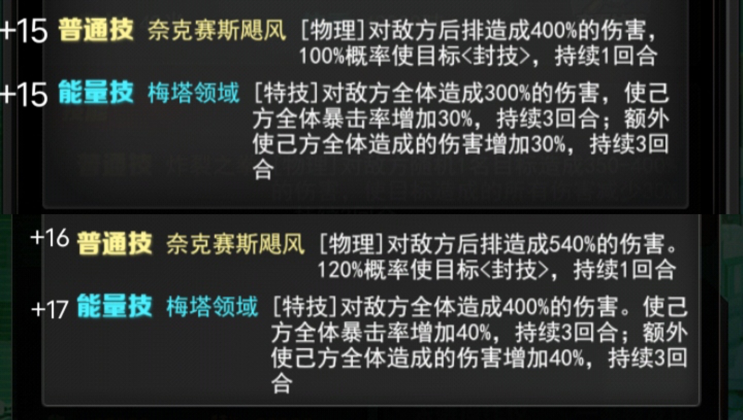 +16 普通技奈克赛斯飓风[物理]对敌方后排造成540%的伤害。120%概率使目标<封技>,持续1回合