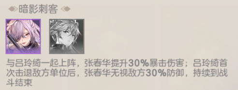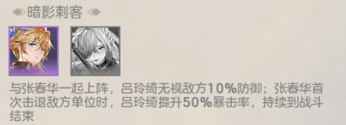 张春华+吕玲绮同时上阵,吕玲绮获得10%无视防御的属性不说,春华首次击杀武将,吕玲绮瞬间变成暴击达人(全程+50%暴击几率),基本只要命中都是枪枪暴击,后期给资源点杀武将还是挺猛的。不仅如此,张春华还获得30%暴击伤害加成,与怒攻附带+30%暴击率无疑是“黄金搭档”