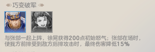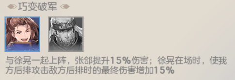 在张合存活的情况下,前排能享受到降低15%的伤害;而徐晃存活的情况下,又能使后排加强对敌方后排+15%的伤害,不管对于张郃还是春华来讲,都是非常好的属性加持。