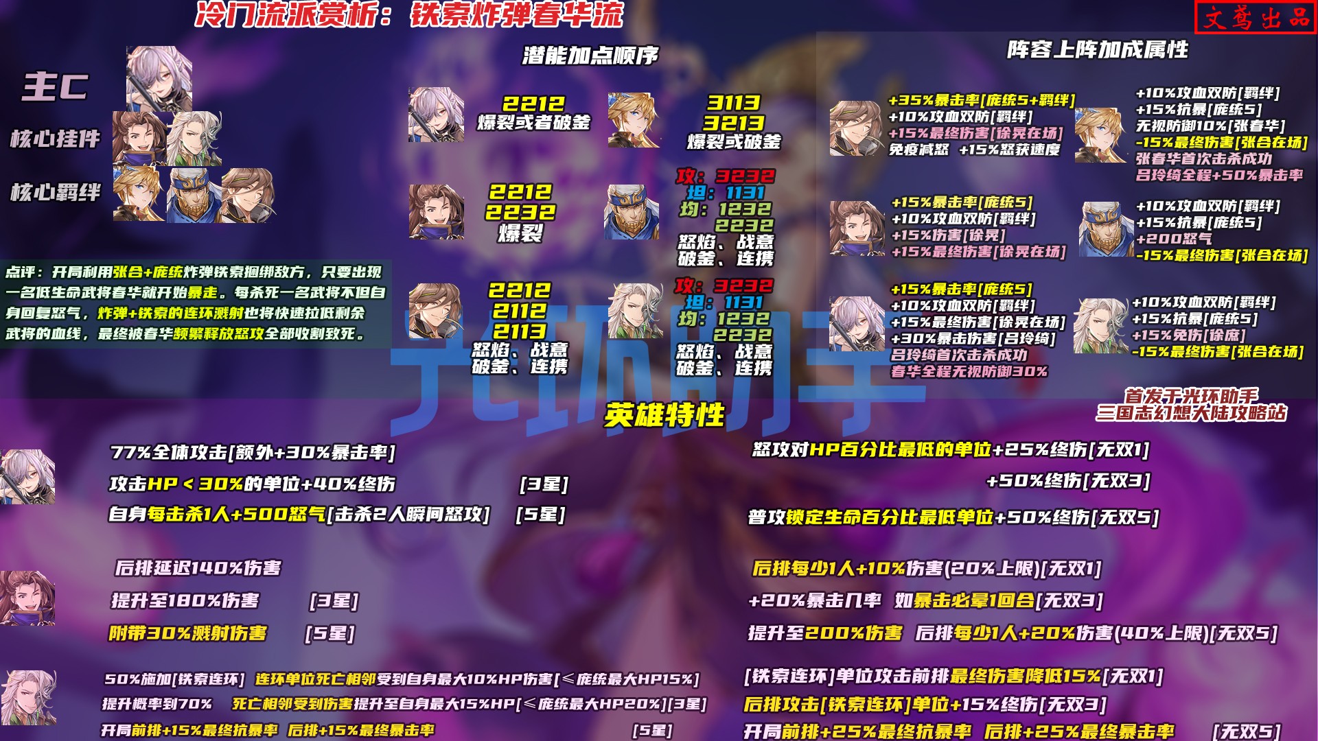 本期攻略,文鸢就给大家介绍一下你们从没见过的冷门搭配,以极限张春华为主力核心的群攻收割队。我称之为铁索炸弹春华流。