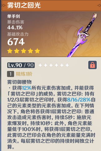 雾切是一把高元素伤害加成的武器,被动叠满情况下能提供40%的高额元素伤害加成。武器本身提供暴击伤害和元素伤害加成,是一把输出型武器。平a元素伤害造成、开q、q能量未满时获得28%增伤。白值674高,爆伤44.1%也很好。这把武器是我最喜欢的一把,没有之一。因为强而且触发特效时十分的好看。