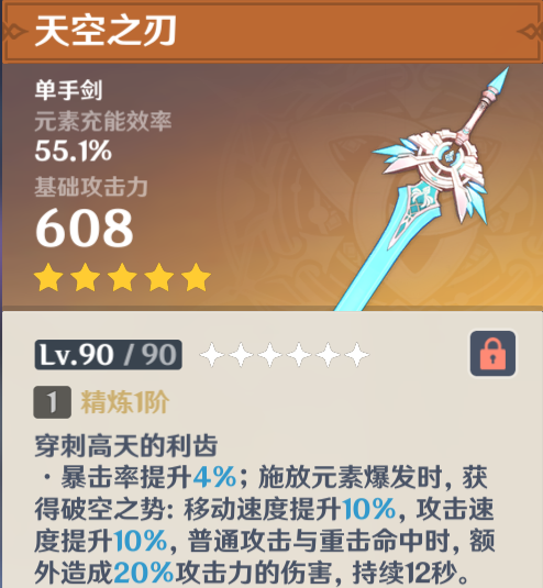 天空之刃是一把提供高额元素充能效率的武器,同时具备少许的输出属性。武器本身提供高额的充能和少量暴击,是一把辅助型武器。华而不实特效,白值608,副属性充能55.1%。最早的一批开服老武器了,年代虽然久远,但是老而弥坚,班尼特毕业武器,琴、风旅行者等有开大需求的辅助也可以用。