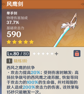 风鹰剑是把高攻击白值的武器, 受到攻击时回复血量并造成伤害。武器本身提供高额的白值攻击,被动触发条件简单,是一把可输出可辅助的武器。白值674,物理伤害加成41.3%,攻击力提升20%,物刻,物理七七毕业武器
