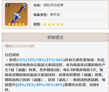 波乱是一把普攻提升较大的输出武器, 精一就有高达40%的普攻伤害提升。武器本身提供暴击和元素伤害加成,适用于输出角色。这把武器在特效设计上就体现了比较明显的专武概念,专人专用,特效泛用性差。特效是两名队友+自己释放e后获得8s的40%普攻增伤。大舅哥专武,特效与副属性都完美契合了大舅哥,是其毕业武器