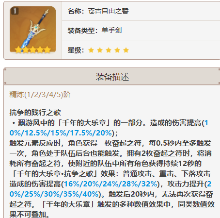 苍古自由之誓是一把兼具输出与辅助的武器,对普攻、重击和下落攻击有不错的辅助效果。武器本身提供高额的元素精通并提升造成的伤害,适用于精通收益角色。这是游戏里推出的第一把五星精通的武器。武器特效是触发元素反应后提升全队平a伤害,并提升攻击力,后台也可触发。白值608中档,副属性198精通,目前游戏里单手剑最高精通副属性,毕竟五星。