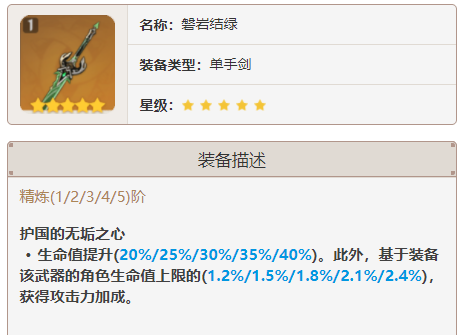磐岩结绿是一把高暴击武器,基于生命值提高攻击力。武器提供高额的暴击,无触发条件,是一把输出型武器。磐岩结绿高额的暴击和生命转攻击使得其适用性极高,对于生命提升输出的角色更是极为适合。武器又能加攻击又能提高容错率坦度,武器低白值的缺点需要攻击力去弥补,高暴击率可以缓解圣遗物压力,可以说是更吃香了。泛用性很好