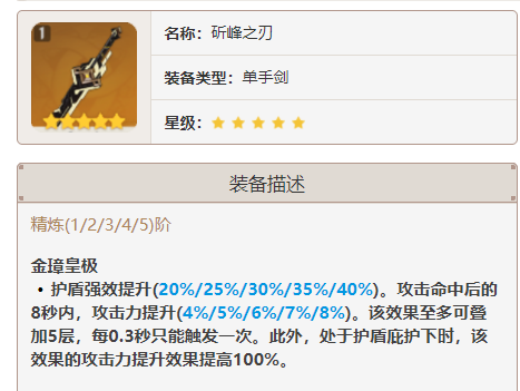 斫峰之刃是一把攻击力加成的武器,被动叠满情况下能提巨额攻击力加成。武器本身提供攻击力和护盾强效,是一把输出与辅助兼具的武器。斫峰之刃对有护盾加持的角色加成较大。白值608,副属性大攻击49.6%,装备这把武器时对双暴要求有点高,需要尽可能配平下面板。