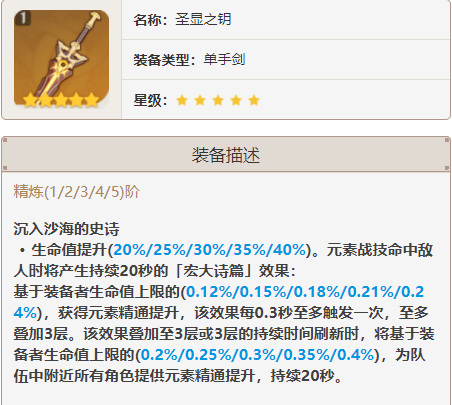 圣显之钥是一把提供生命和元素精通加成的武器,同时还能提升队友精通。武器本身提供高额的生命加成,是一把输出与辅助兼具的武器。妮露专武,提升巨大,专武之下,其他武器众生平等。根据生命值上限给精通,e三次叠满后还能给队友提供精通。白值542低,副属性生命值66.2%
